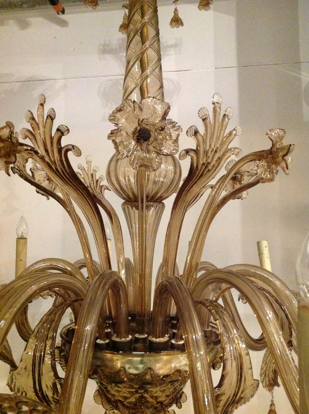 Very hard to find in perfect condition twelve arms impressive smoked Murano glass chandelier. Neoclassical palms and flowers, rare shape and realy well blowned by the glass Master. 100% perfect vintage condition. Circa 1930. High: 170cm, Large: 130cm